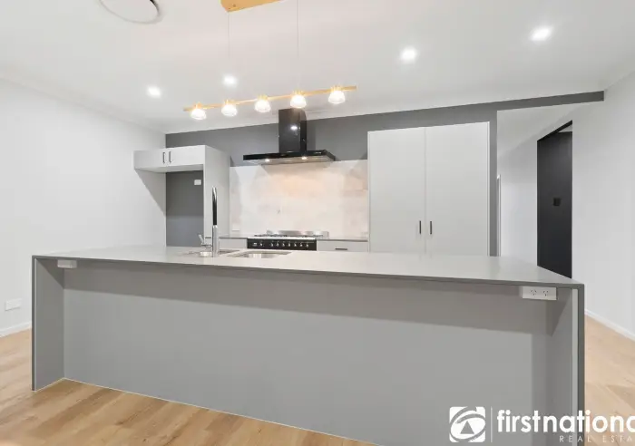 The sleek modern kitchen is designed with family living in mind, featuring a large Caesarstone island bench, 900mm gas cooktop and oven, elevated rangehood, and fully integrated hidden Miele dishwasher.